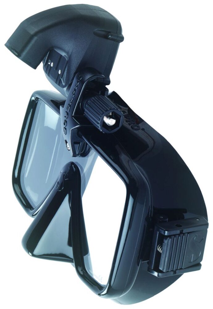 SCUBAPRO's FRAMELESS HUD Mask is diving's original frameless mask modified to fit the new Galileo HUD Hands-Free Computer. The Galileo HUD Hands-Free Computer Frameless Mask offers a convenient integrated HUD adapter for secure placement of the dive computer. Its rectangular single lens shape is classic, providing clear field of view on the periphery as well as straight ahead. The soft silicone skirt and double-edge seal is comfortable and feels good against the skin. The buckle system is easy to use and allows for quick adjustments. Buckles attach to flexible tabs on the skirt; this optimizes strap angle when dialing in fit. The wide headband spreads the load on the back of the head, greatly enhancing comfort.