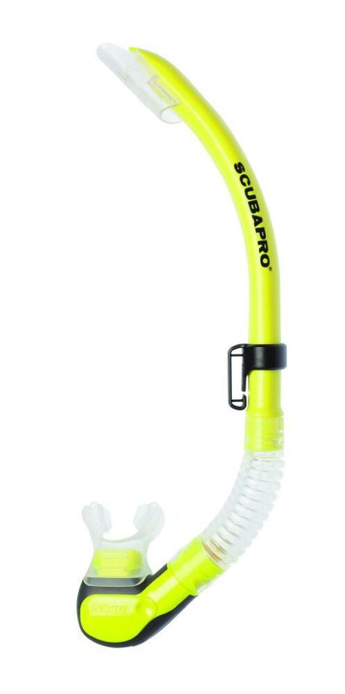The NEXUS is one of SCUBAPRO's premium snorkels. It features an oval-shaped, large-bore upper barrel that minimizes drag while allowing lots of air to flow. The barrel is fitted with a splashguard-style top to deflect surface water. At the other end there's an angled purge valve designed to divert bubbles out of your line of sight. The rotating mouthpiece can be positioned perfectly for maximum comfort. When breathing off a regulator, the snorkel's corrugated lower section drops out of the way. The NEXUS offers another handy feature: the upper barrel is flexible, so you can fold it for stowage in a BC pocket.