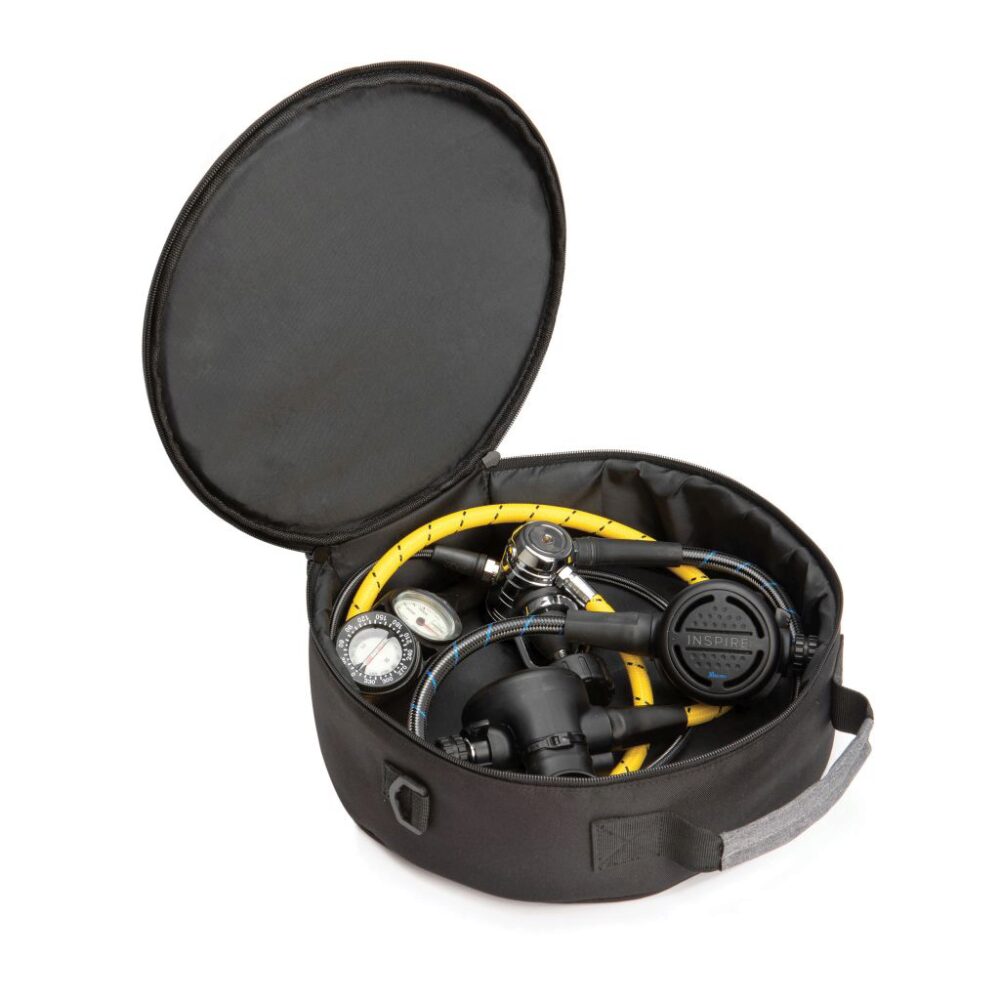 Protect your regulator and instruments with this fully-padded Voyager 5 Regulator Bag. This is a quick and easy way to pull your regulator system out of your large roller bag and carry it aboard the airplane. The circular shape is ideal for coiling your regulator hoses Inner diameter is a full 12 in (30 cm) Attached D-rings will accommodate an optional shoulder strap (p/n BG915) Carrying handle Self-repairing nylon coiling zipper with dual zipper pulls Dimensions: 12 dia. x 4 in deep (30 dia. x 10 cm deep)
